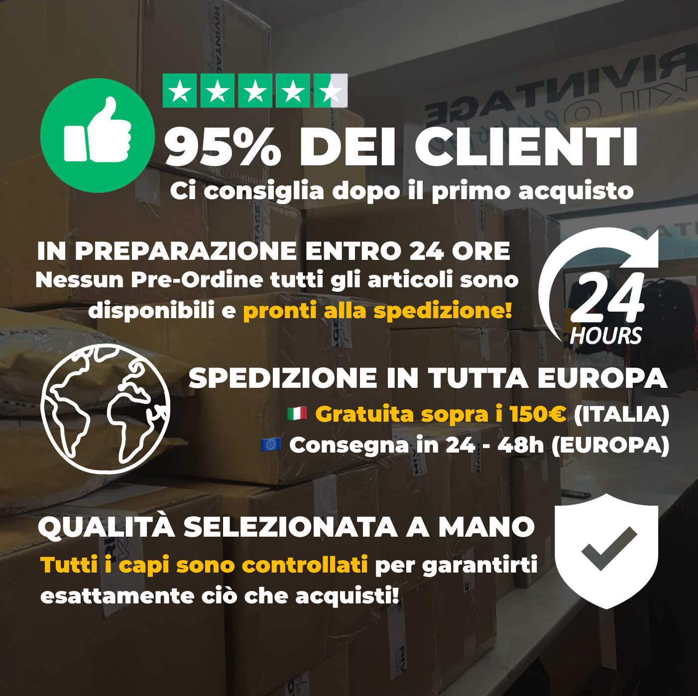 Nous sommes leaders du secteur en Europe depuis plus de 5 ans. Nous offrons à nos clients la plus haute qualité disponible sur le marché, avec des vêtements vérifiés et sélectionnés à la main. A cela s'ajoutent : des paiements sécurisés (même échelonnés), un vaste choix d'articles, une assistance immédiate et des livraisons rapides dans toute l'Europe.